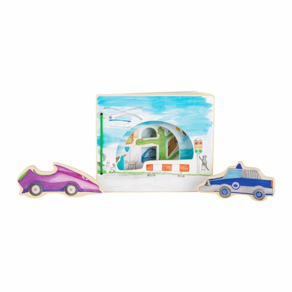 Hier ist Action garantiert! Mit diesem liebevoll gestalteten interaktiven Bilderbuch aus FSC® 100%-zertifiziertem Holz lernen Kinder die Polizei und ihre Funktion kennen. Mit dem Polizeiauto geht es los zum ersten Einsatz! Die Holzfiguren regen die Phantasie an und bieten Kindern die Möglichkeit, sich eine eigene Geschichte zum Geschehen auszudenken und diese nachzuspielen. Nachdem der Verbrecher gefasst ist, werden die beiden Holzautos ganz einfach an den praktischen Klettverschlüssen auf der Rückseite des Buches befestigt. Ein lehrreiches Buch, um spielerisch die Phantasie und das Geschichtenerzählen zu fördern. Dieser Artikel ist mit den anderen interaktiven Holzbüchern kombinierbar.