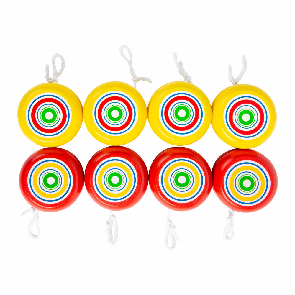 8er Set (Vier rote und vier gelbe Jo-Jos). Aus bunt lackiertem Holz gearbeitet, faszinieren diese Bewegungsspielzeuge Kinderhände! Schult die Motorik und steigert die Begeisterung an den eigenen Fähigkeiten.