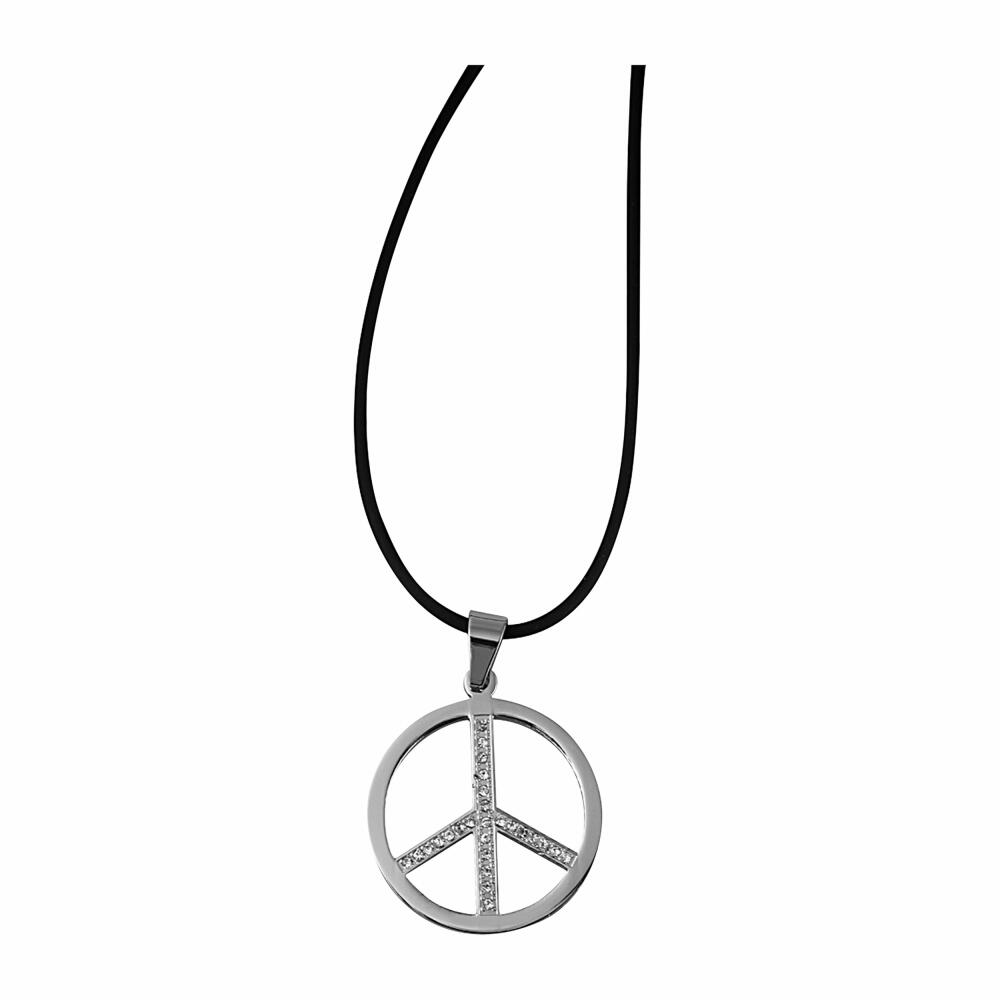 Aus glänzendem Edelstahl kunstvoll gefertigt, trägt dieser Anhänger (ca. 3 x 3 cm) den Wunsch nach Frieden an die Öffentlichkeit. Viele eingearbeitete, glitzernde Steinchen ziehen mit ihren Lichtreflexen die Blicke auf sich. Dezent schwarze Kette aus Kautschuk betont das schlicht schöne Design des Anhängers.