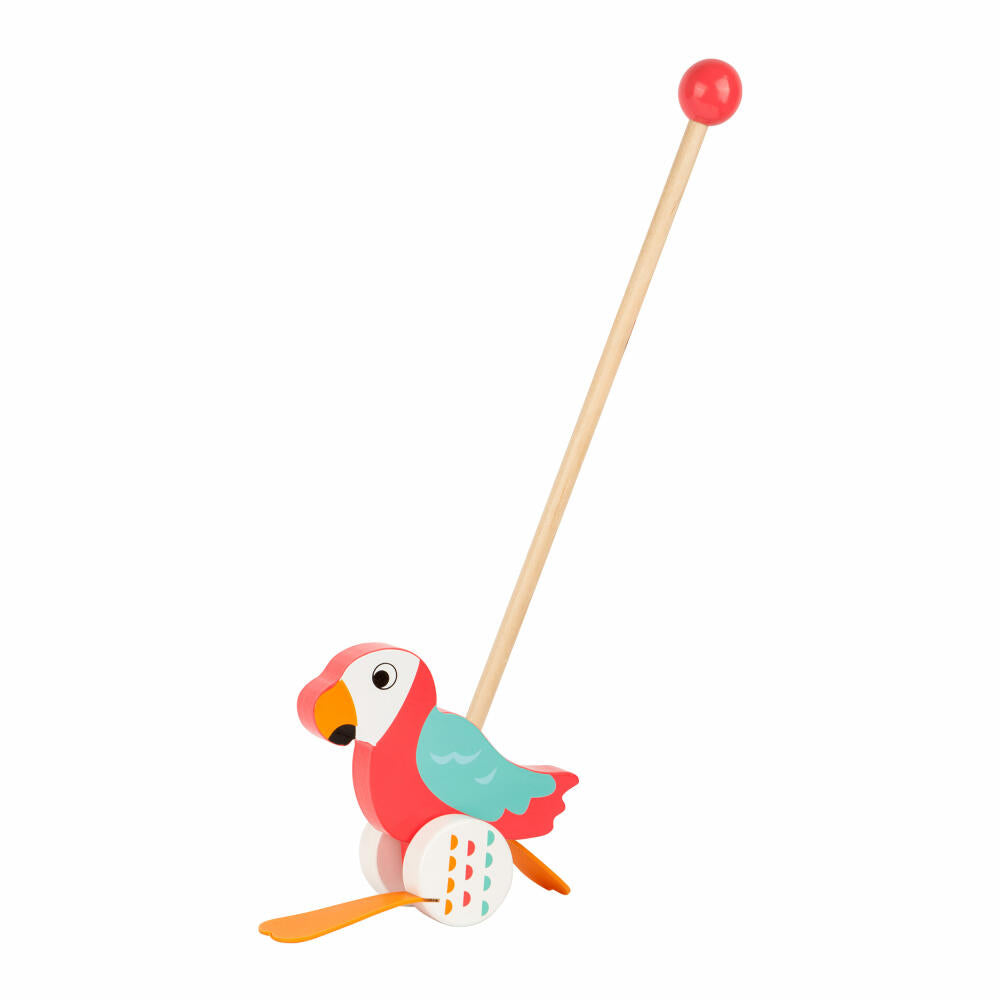Mit diesem bunten Papagei geht doch jedes Kleinkind gerne spazieren. Beim Anschieben watschelt der lustige Gefährte bei jeder Umdrehung der Räder mit den Füßen. Durch die Holzkugel am Griff lässt sich der unterhaltsame Begleiter sehr gut führen.