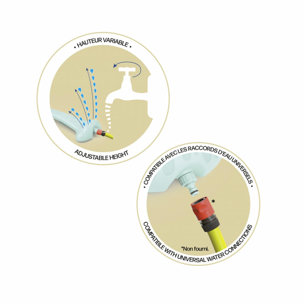 Platziere den Wassersprenkler unter einer Outdoor-Rutsche und schon entsteht eine coole Wasserrutsche mit Springbrunnen-Tunnel zum Durchrutschen! Das Wasserspielzeug ab 2 Jahre kann an jeden gewöhnlichen Gartenschlauch angeschlossen werden und ist kompatibel mit allen Arten von Rutschen.