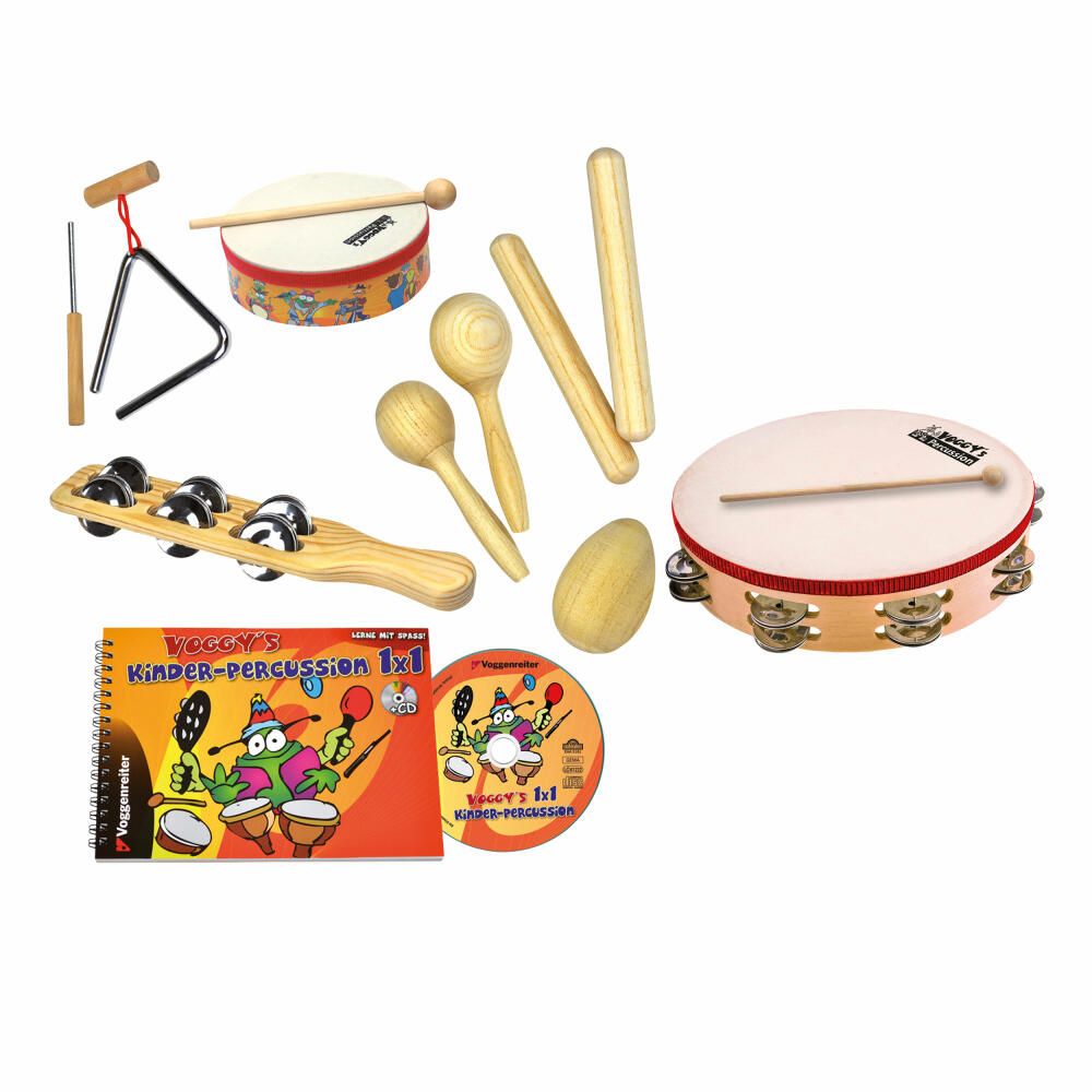 Voggenreiter Percussion-Set, 11-tlg., Maracas, Trommel, Triangel, Egg-Shaker, Großes Tamburin, Schellenkranz