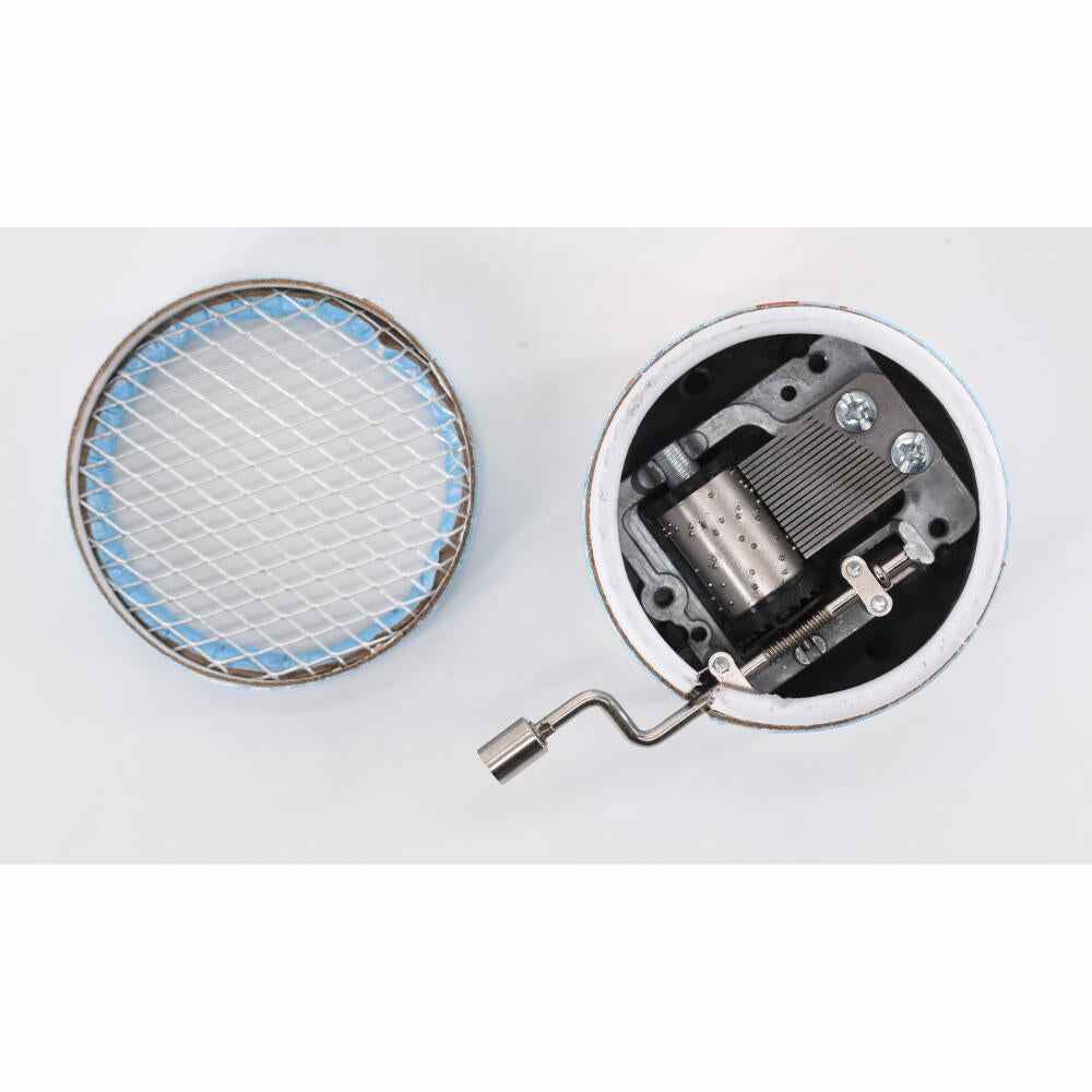 Die Spieluhren haben einen Durchmesser von 6 cm und eine Höhe von 4,5 cm. Die Handkurbel ist dreifach gesichert und lässt sich von kleinen und großen Fingern einfach bedienen. Das millionenfach bewährte Qualitäts-Spielwerk hat einen widerstandsfähigen Metallrahmen, doppelt verschraubte Metall-Klangzungen und ist fest und sicher auf dem Resonanzboden befestigt. Ein Metallgitter schützt die Spieluhr und ermöglicht zugleich einen ungestörten Blick auf die faszinierende Mechanik. Das umweltfreundliche, robuste Kartongehäuse schützt vor Verunreinigungen und Beschädigungen und dank des abnehmbaren Deckels ist die Reinigung der Spieluhren kinderleicht.